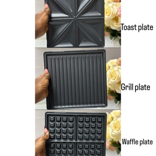 - The 3 in 1 sandwich maker features thermostatically-controlled plates that ensure even cooking. There is also a safety latch that ensures the toaster stays closed when in use. Non-stick coated cooking plates, Power on and ready neon indicators. with Floating hinge and variable heat setting, Cool touch handles. Other components include removable plates for easy cleaning and open flat for using as griddle. It comes in three detachable plates, sandwich, grill and and waffle plate.A rich sandwich, crispy panini, or a fluffy waffle can be made in few minutes.