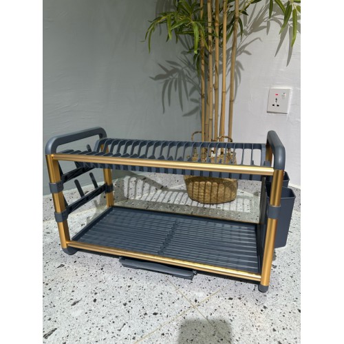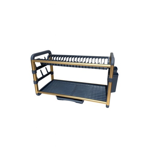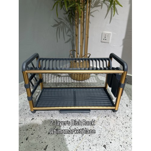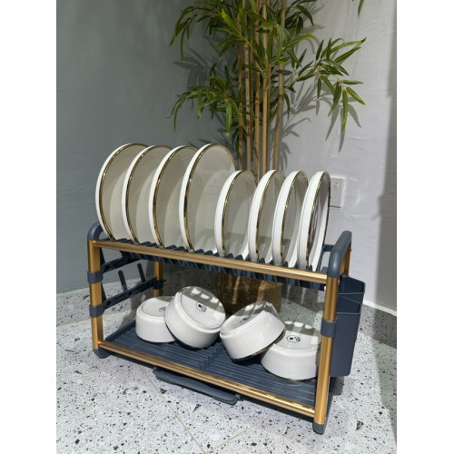 Bring style and order to your kitchen with this 2-Layer Deluxe Dish Drying Rack, designed not only for storage but for luxury. Its gold-accented frame paired with matte grey trays adds a touch of elegance to your space while keeping dishes dry, clean, and perfectly organized.